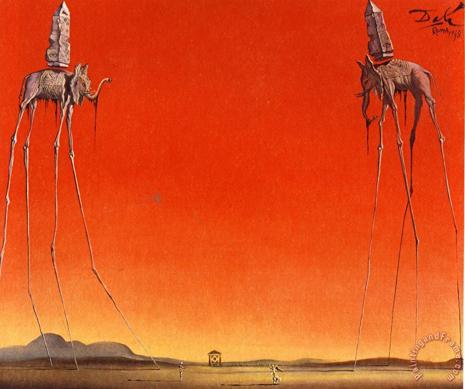 In his 1948 painting ‘‘The Elephants’’ Salvador Dali invites us to contemplate the fleeting nature and tenuousness of power. Upon first glance The Elephants seems typically nonsensical and surrealist. However, upon closer inspection something else is revealed to us. The elephants are a symbol of power and majesty, they appear almost to hover above the earth, defying gravity as indeed the obelisks (phallic symbolism) floating above their backs actually do. The question we’re asking ourselves subconsciously is, is this a snapshot frozen in time? or is this is a permanent state of affairs? The elephant on the right in the painting appears to be a little off-balance as if its about to face-plant into the ground.